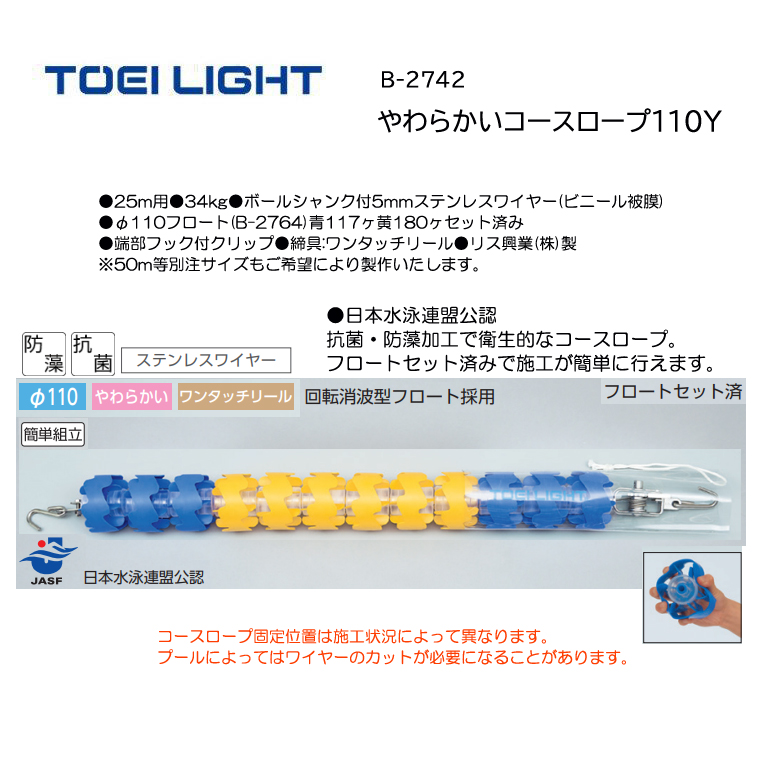 抗菌・防藻加工で衛生的なコースロープ。フロートセット済みで施工が簡単に行えます。
