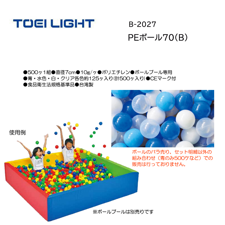 ●500ヶ1組●直径7cm●10g/ヶ●ポリエチレン●ボールプール専用●青・水色・白・クリア各色約125ヶ入り(計500ヶ入り)●CEマーク付●食品衛生法規格基準品●台湾製