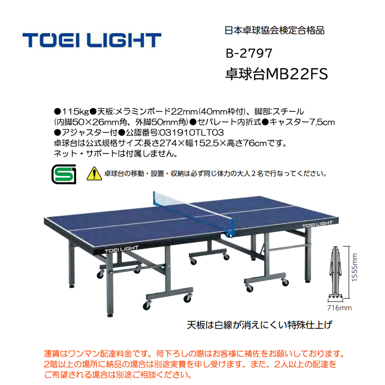 運賃はワンマン配達料金です。荷下ろしの際はお客様に補佐をお願いしております。2階以上の場所に納品の場合は別途実費を申し受けます。また、2人以上の配達をご希望される場合は別途ご相談ください。卓球台の移動・設置・収納は必ず同じ体力の大人2名で行なってください。