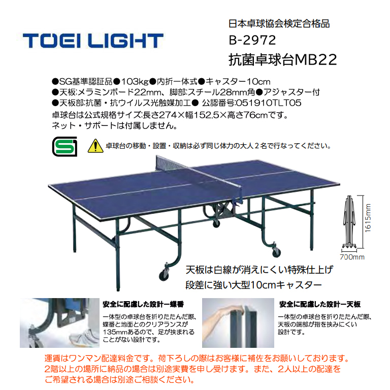 運賃はワンマン配達料金です。荷下ろしの際はお客様に補佐をお願いしております。2階以上の場所に納品の場合は別途実費を申し受けます。また、2人以上の配達をご希望される場合は別途ご相談ください。卓球台の移動・設置・収納は必ず同じ体力の大人2名で行なってください。