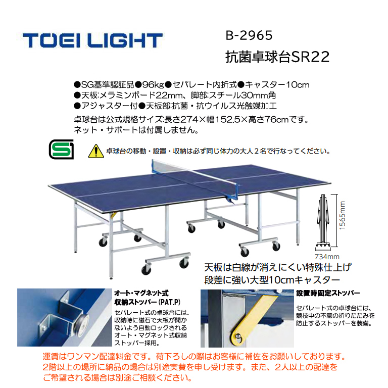 運賃はワンマン配達料金です。荷下ろしの際はお客様に補佐をお願いしております。2階以上の場所に納品の場合は別途実費を申し受けます。また、2人以上の配達をご希望される場合は別途ご相談ください。卓球台の移動・設置・収納は必ず同じ体力の大人2名で行なってください。