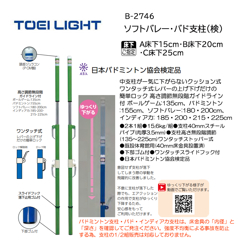 バドミントン支柱・バド・インディアカ支柱は、床金具の「内径」と「深さ」を確認してご発注ください。強度不均衡による事故を防止する為、支柱の1/2組販売は対応しておりません。
