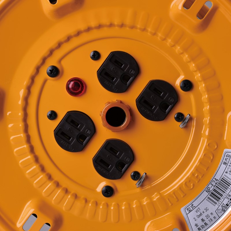 ドラム型本体に巻きつけた延長電源コードで、電源から離れた場所でも電気を使う事が出来ます。コードの長さは20m・3芯4口仕様。