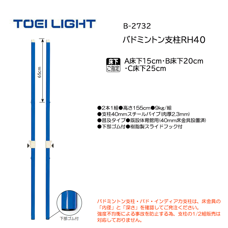 バドミントン支柱・バド・インディアカ支柱は、床金具の「内径」と「深さ」を確認してご発注ください。強度不均衡による事故を防止する為、支柱の1/2組販売は対応しておりません。
