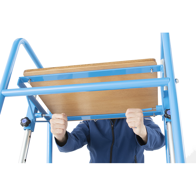全長142cmのコンパクト仕様で、ベースを均一の高さに調節可能なゴムアジャスター付きです。また、立ち台の板面は7段階(60~120cm)の調節が可能です。
