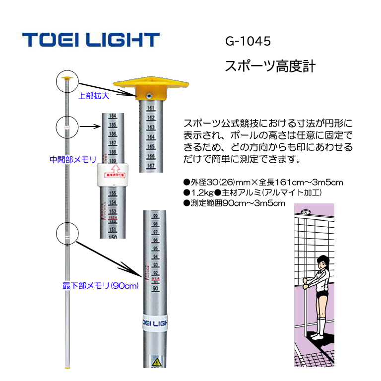 スポーツ公式競技における寸法が円形に表示され、ポールの高さは任意に固定できるため、どの方向からも印にあわせるだけで簡単に測定できます。