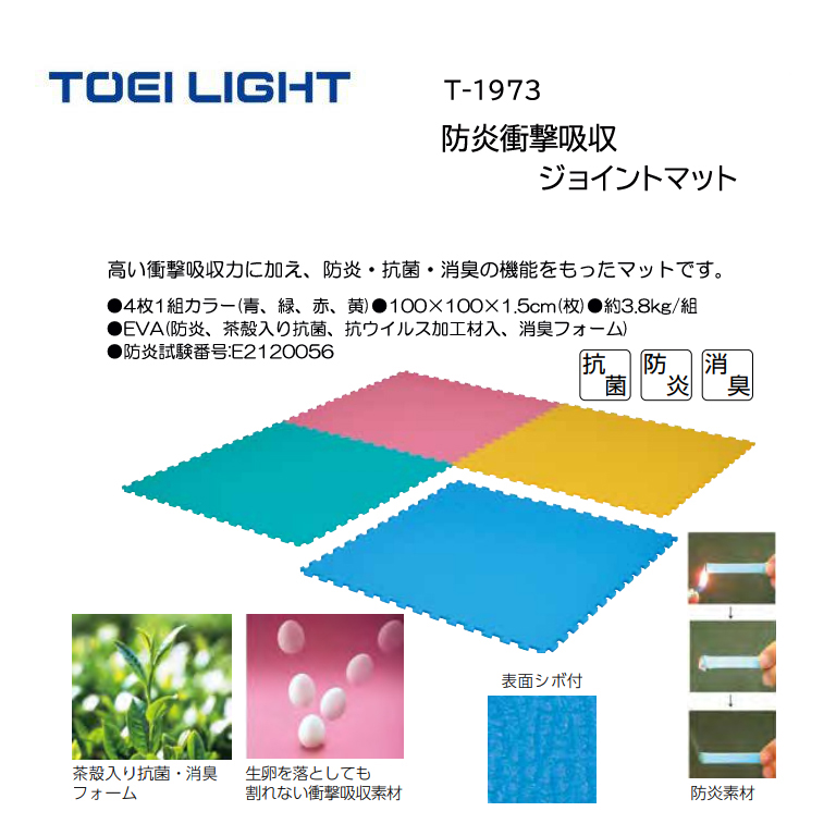 ●4枚1組カラー(青、緑、赤、黄)●100×100×1.5cm(枚)●約3.8kg/組●EVA(防炎、茶殻入り抗菌、抗ウイルス加工材入、消臭フォーム)●防炎試験番号:E2120056