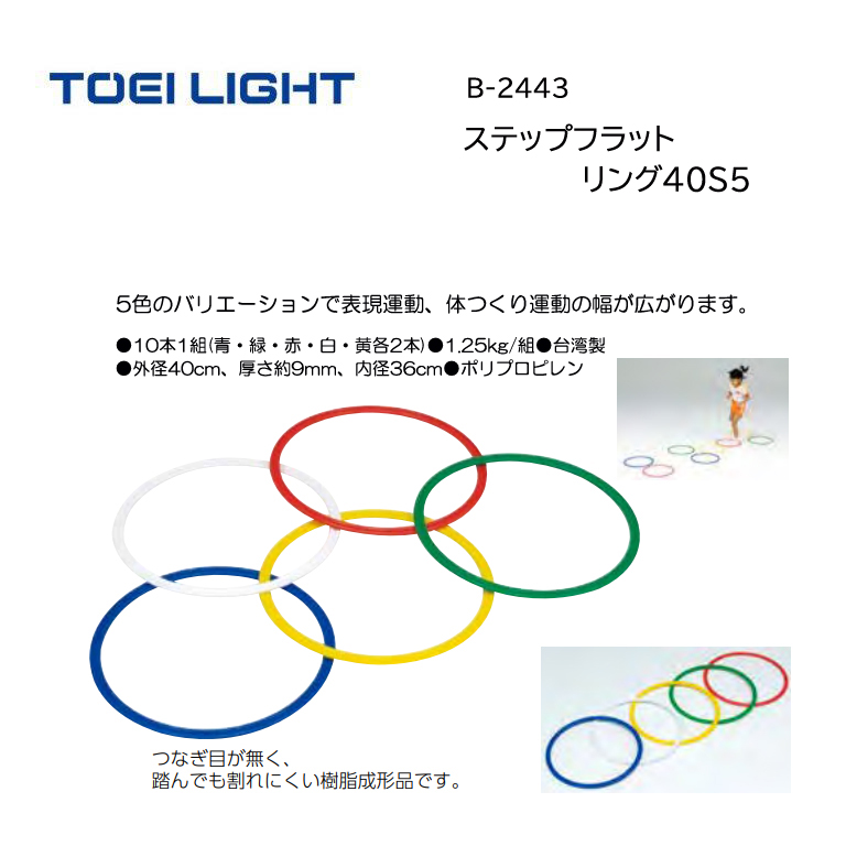 ●10本1組(青・緑・赤・白・黄各2本)●外径40cm、厚さ約9mm、内径36cm●1.25kg/組●ポリプロピレン●台湾製