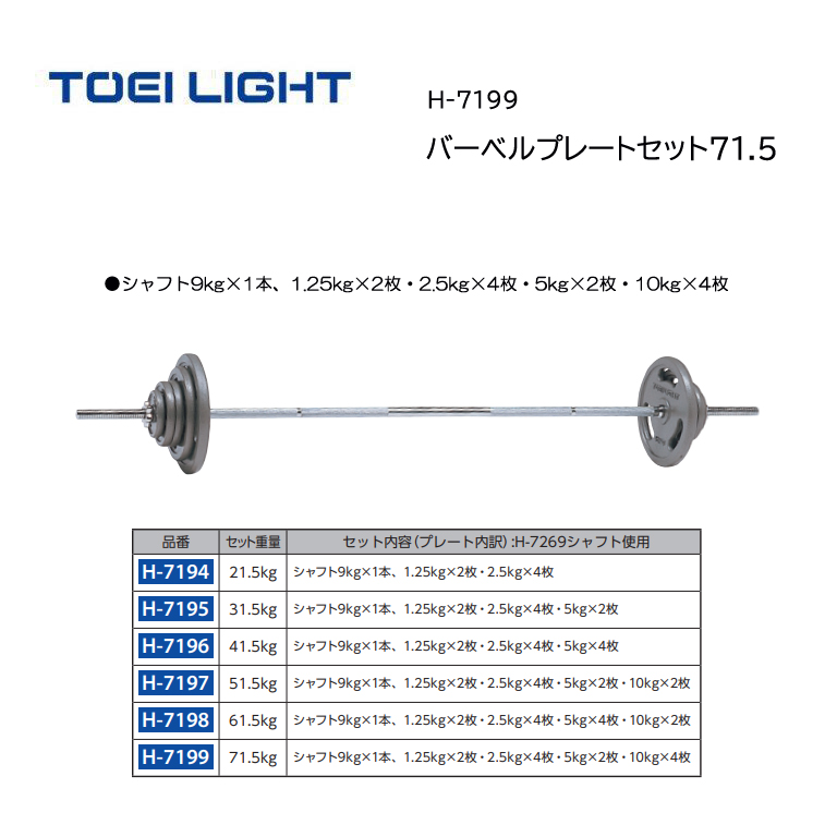 ●シャフト9kg×1本、1.25kg×2枚・2.5kg×4枚・5kg×2枚・10kg×4枚(総重量:71.5kg)